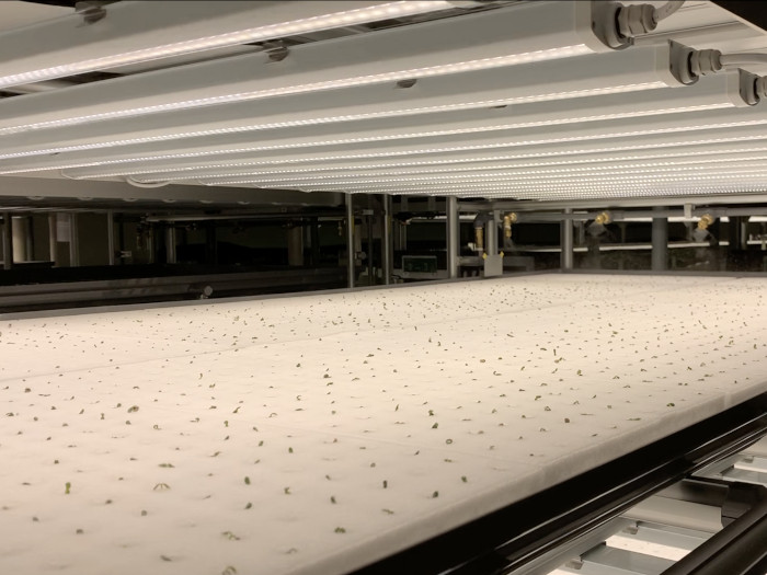 育苗室では、直径数mmの種⼦が数cm四⽅に区切られたウレタン製の苗床に植え付けられる。ここで露地栽培のような昼と夜をつくるためにLEDライトを点灯・消灯し、一定の間隔で散⽔すると数⽇ほどで発芽する。苗が⼀定の⼤きさに育つと⼗数cm四⽅のパレットに移植して栽培室に送り、出荷に適したサイズに育てられるという。