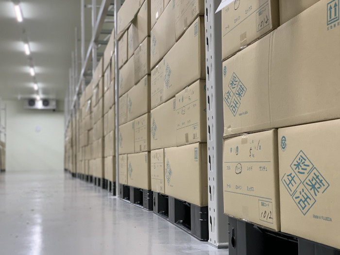 段ボールに梱包されたリーフレタスは、出荷までの間、冷蔵庫で保管される