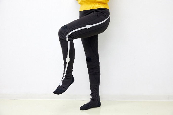 一見、タイツやスパッツのようだが、両足の外側にいくつものセンサーが組み込まれ、そこで読み取られたデータが同様に服に組み込まれた薄型回路を通して腰に装着されたハブに集約され、自動的にPCに送信されていく。