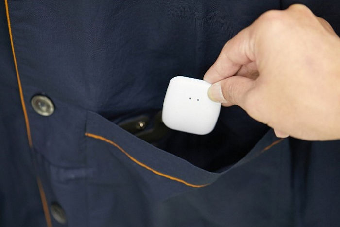 こちらは、左ポケットの中にハブが装着できるようになっており、組み込まれるセンサーも数cmサイズのものが第3、第4ボタンの間付近に1つだけ。人の動きを緻密に計測する「e-skin MEVA」と比べると、かなり簡略化された作りになっている。