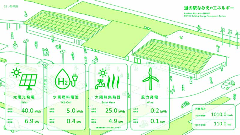 同敷地内において表示されるデジタルサイネージ。太陽光、水素燃料電池、太陽熱集熱器、風力による発電量と施設の消費電力を表示することで、訪れた住民の節電意識を醸成していく