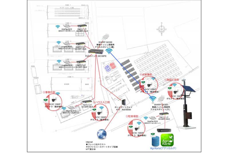 「AgriNova」施設の全体図、およびIoTネットワークの構築図。A棟、C~E棟の温室内には小温室が1~3棟ずつ設置されていることが確認できる。加えて、作業記録用の動態検知カメラを20基ほど設置。無人であることが大半の施設にとって防犯システムの役割も担う