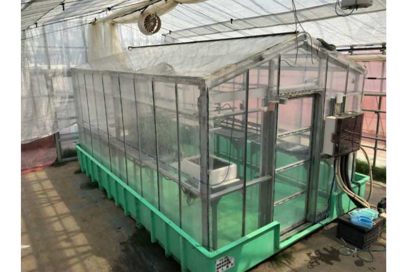 与圧式二重構造の棟内は、FRP(繊維強化プラスチック)製の船型の台(画像の緑色部分)の上に設置された小温室で育苗。外部からの熱伝導を遮断し室内環境をIoTでコントロール・ 管理している。FRPの台は、茨城県鉾田市の船舶・水槽製造業者に開発を依頼した