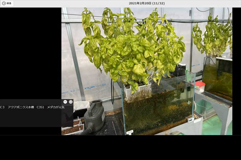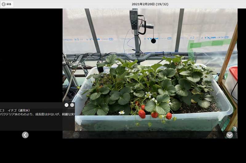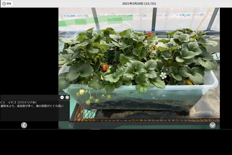 小温室で育てられている苗は、毎日生育の様子が撮影され、作業・環境データと一元的に確認することができる。写真は2月に植えられたイチゴ(通常の水で育成)