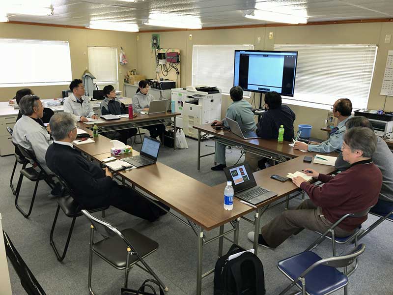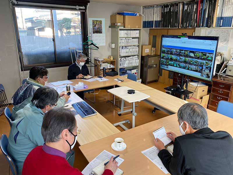 馬渕工業所とのオンライン会議を行う福相建設のスタッフ。同社は従業員の半数以上が稲作中心の兼業農家で、その経験を生かして事業をサポート。「『天候に左右される農業からIoTによる農業への移行を』をという馬渕工業所さんの提案は、農業従事者として魅力的でした」(画像奥の右から2番目が農事プロジェクト担当・佐藤 洋氏)