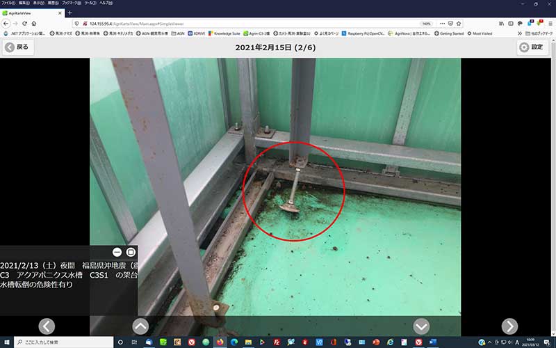 「建物への被害はありませんでしたが、水槽や配管など設備の損傷が画面越しに把握できました。ただ、すぐに対処が必要な事態でないことは記録から確認できたので、福相建設さんと連携し、元々施設へ赴く予定の日に修繕していただき事なきを得ました」(本村氏)
