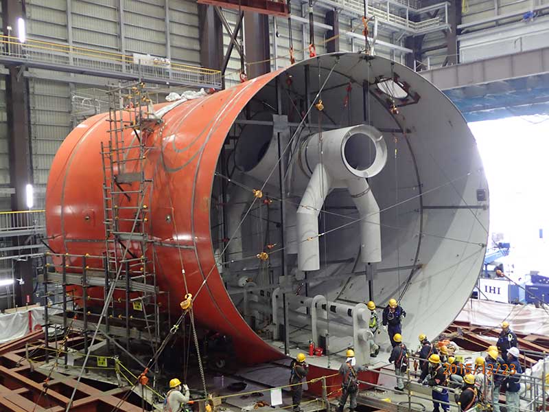 IRIDが行う「原子炉格納容器漏えい箇所の補修技術の実規模試験」。画像に写るスタッフとの比較で、この設備の巨大さが分かる