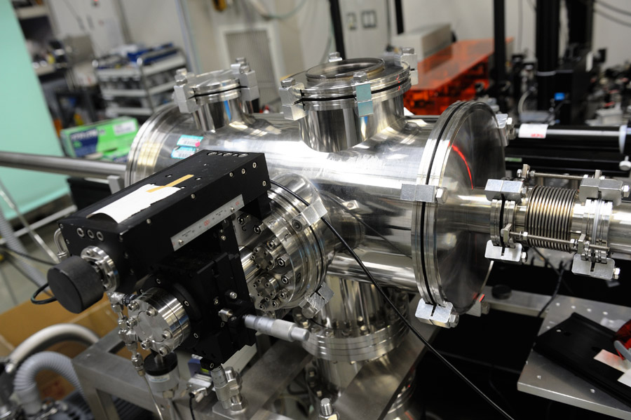 実験棟に設置されている、強い『アト秒パルスレーザー』を発生させる決め手となった“ガスセル”(手前の筒状の金属)。奥に設置されている装置で個体結晶により発振されたフェムト秒パルスレーザーが増幅されてこのガスジェットに送られ、この中でアト秒パルスレーザーを生み出す