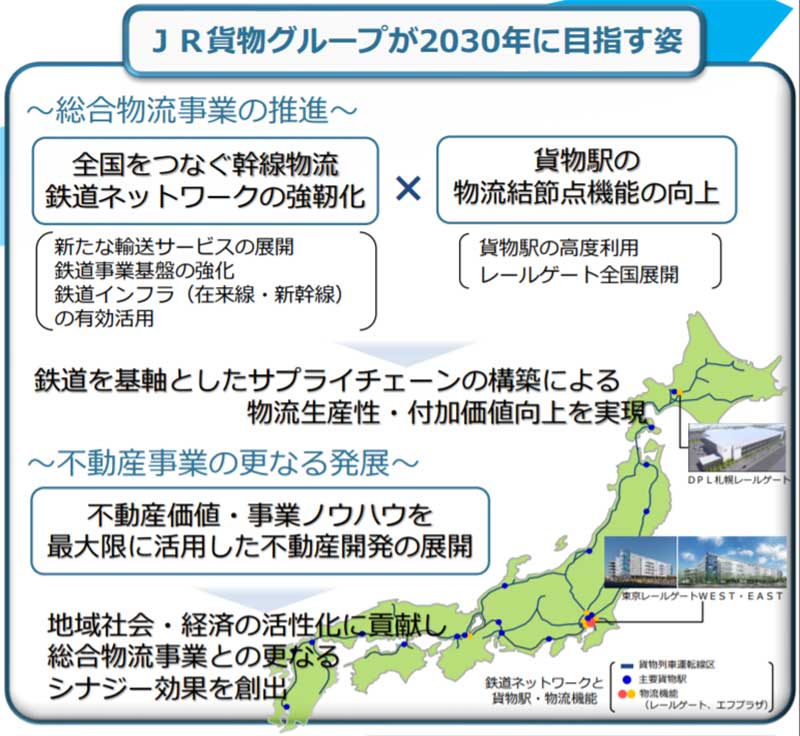 長期ビジョンには、全国をつなぐ幹線物流鉄道ネットワークの強靭化と貨物駅の物流結節点機能の向上を図り総合物流事業を推進すること、不動産事業を更に発展させて総合物流事業にそのノウハウを生かすことなどが基本方針として掲げられている