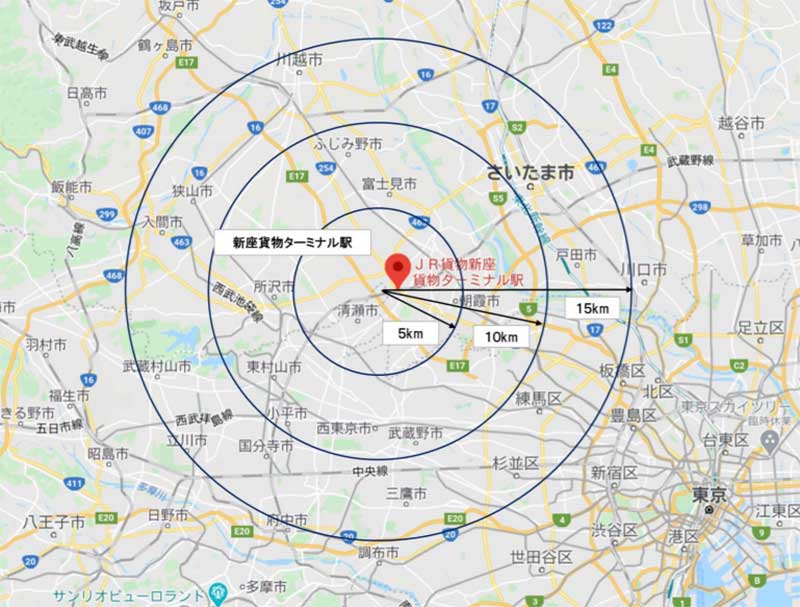 新座貨物ターミナル駅からの各地への距離イメージ。同駅は関越自動車道、東京外環自動車道のICへ3~6kmの好立地で、利用運送事業者10社と契約し、宅配貨物や引っ越し貨物、飲料・生活雑貨などの品目でニーズが高い