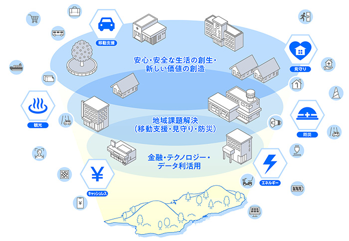 八丈島におけるスマートアイランド化のイメージ。デジタルテクノロジーの活用によって、さまざまな地域課題を解決へと導く
