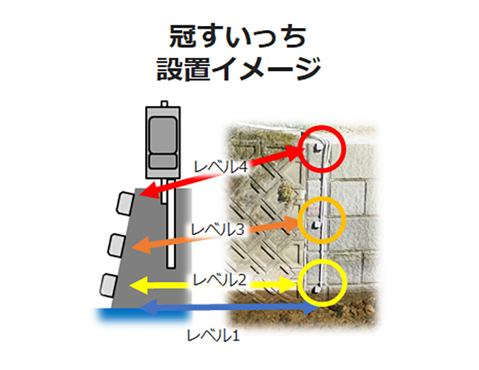 例えば、河川の壁面に高さを変えて多段設置すれば、水位の上昇に従って、注意・警戒・避難のレベルに応じた通知をすることもできる。