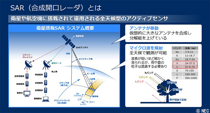 レーダー画像の規模や感度を高めるには、電波を発射するパラボラアンテナのサイズを大きくするのが手段の一つとなる。しかし、単純に巨大化させると衛星の運用などの困難が立ちはだかる。これを解決するのがSARというわけだ。