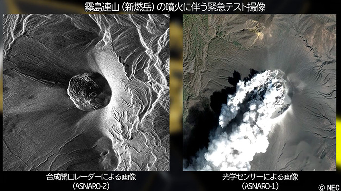 左はSAR、右は光学センサー(デジタルカメラの技術)の画像。SAR画像は噴煙を透過し、火口までくっきりと見える