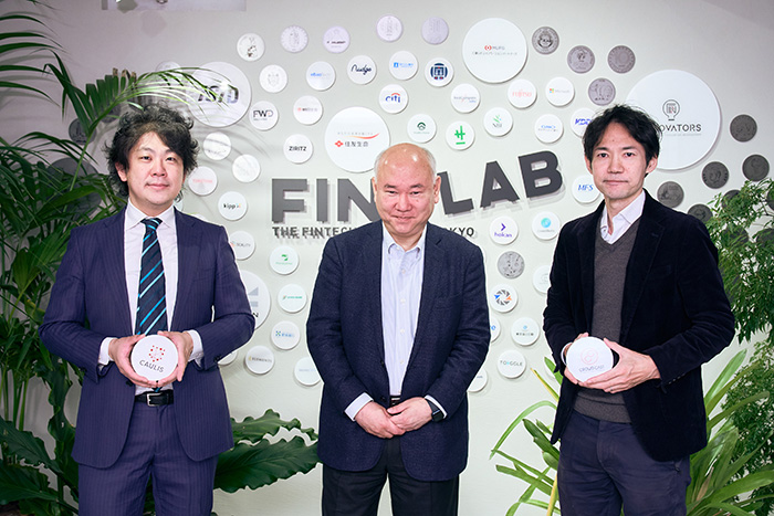 Head of FINOLAB兼CCOの柴田誠氏(中央)と、株式会社カウリス 代表取締役 島津敦好氏(左)、クラウドキャスト株式会社 代表取締役 星川高志氏(右)
