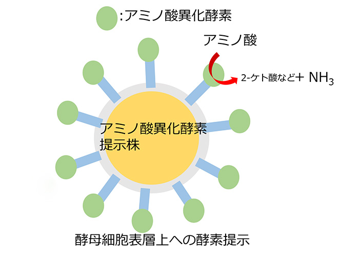 「私たちが研究していたのは、細胞表層工学と言います。酵母(※1)の表面に特定の酵素(※2)を並べたものを用い、食品廃棄物のタンパク質を分解して抽出したアミノ酸を、アンモニアに一斉変換しようという手法です。ただ、普通に酵母を用いるとアミノ酸を酵母の細胞の中に取り込んで、アンモニアではないものに変換してしまう。酵母の表面に酵素を並べて、表面で処理するというのがポイント。だから細胞表層工学なのです」