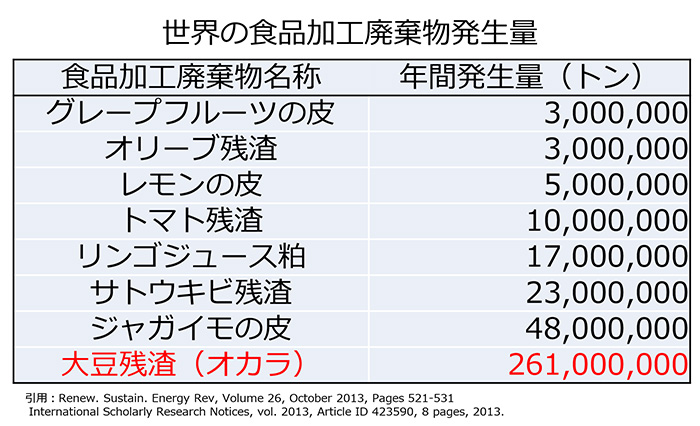 また、諸外国においてオカラは地中に埋めて処分されるのだが、元は植物とはいえ地中に埋めると分解され、地球温暖化の原因となる二酸化窒素(NO2)を発生する厄介者でもある。