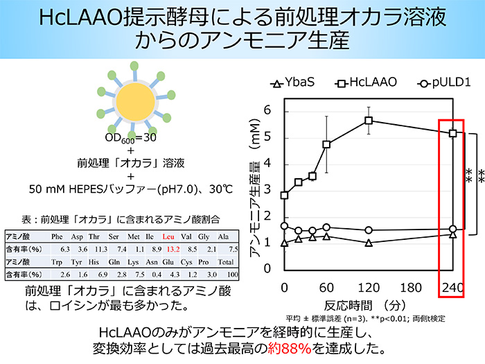 キノコ由来の酵素(HcLAAO)を提示した場合、変換効率は最高88%。およそ2時間で前処理したオカラからアンモニアが生成される