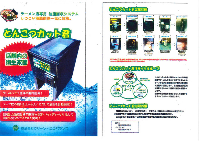 苦労の末に廃油からバイオディーゼル燃料を生成する手法を確立し、自社の敷地内にタンクを作って大量生産を始めた。自社の運送用トラックにも軽油に混ぜて使用するようになった。バイオディーゼル燃料事業が軌道に乗ってきた2013年、地元のラーメン店から相談を受けた。