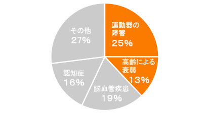日本整形外科学会によれば、健康寿命を引き下げている最大の要因は自立度の低下や寝たきり、つまり要支援・要介護状態になることで、その原因のトップは「運動器の障害(25%)」であるという。これに「高齢による衰弱(13%)」を加えれば、実に原因の約4割が運動器に起因するそう。