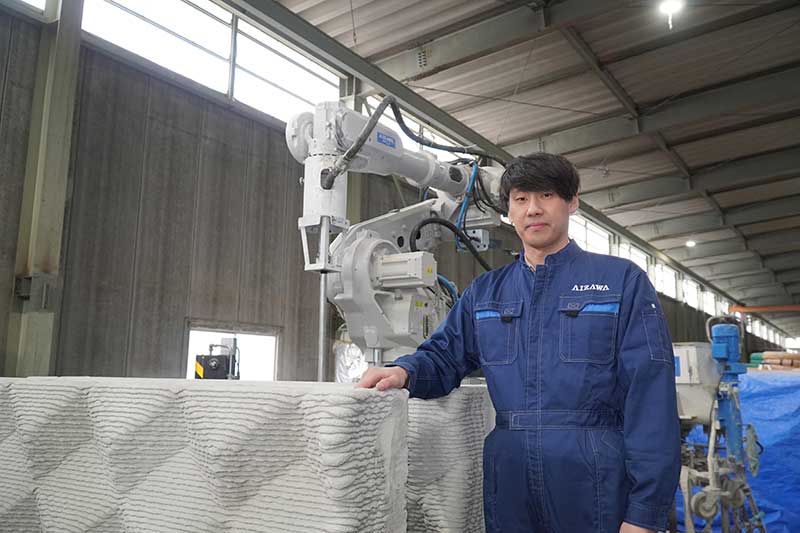 2011年に入社し、プレキャストコンクリート(コンクリート二次製品)の設計に携わっていた東 大智(あずま たいち)氏。2015年より同社の研究開発部門・アイザワ技術研究所の研究員を兼務し、2018年より3Dプリンターの導入・活用に関する研究に取り組んでいる。3次元ソフトウェアで作成した設計データを基に、複雑な断面形状を積層した立体造形を出力する3Dプリンターへの可能性を見いだしたという。