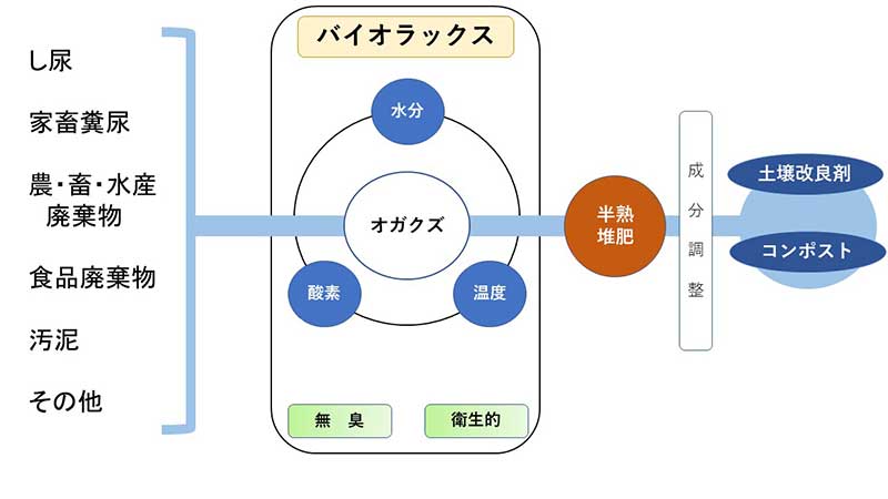 正和電工のバイオトイレの概念図。小便や大便、トイレットペーパーをおがくずで分解処理し、肥料として再利用でき、第一次産業が盛んな日本でも、エコの観点から注目されている
