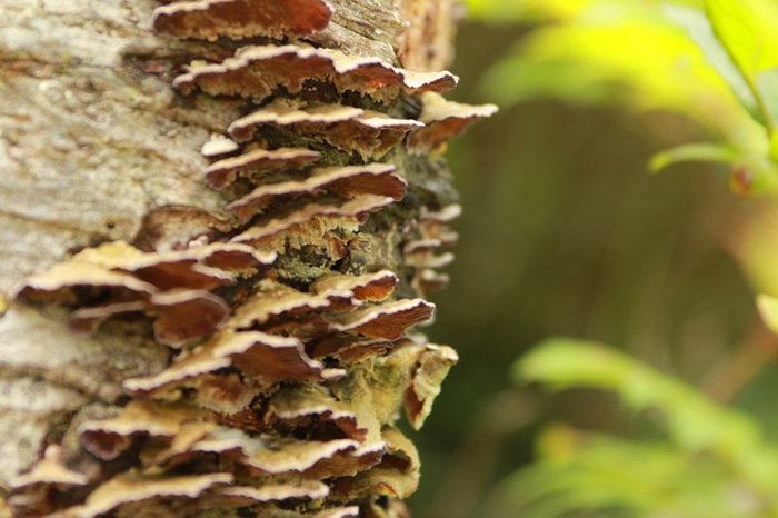 ヒダナシタケ目のキノコが木材を腐朽している様子