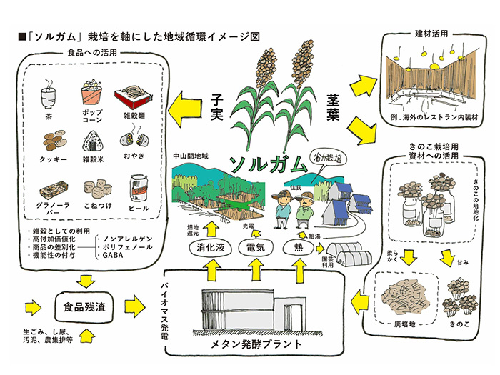 まず、地域でソルガムの実を食用として使ってもらう。茎はペレットにしてキノコの培地(生育させる栽培資材)として農業利用し、使用後のペレットや食品から出る残渣をメタン発酵でガス化。そのガスで発電し、電気と熱を生む。