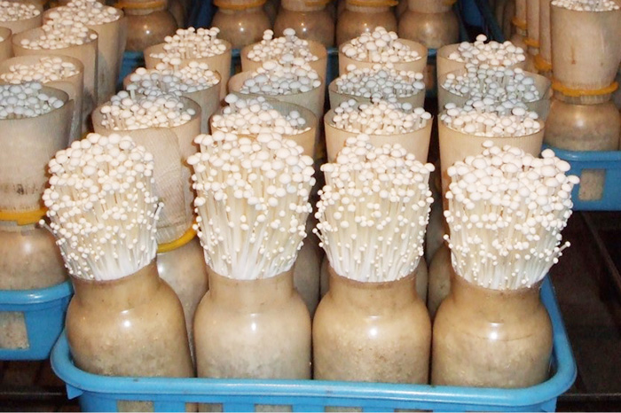 培地を瓶に詰めて、キノコを育てる。写真は実際に育てたエノキタケ