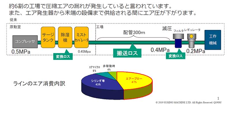 工場における圧縮エア製造過程と消費分布。製造過程で配管内でエアの搬送ロスが生じてしまう