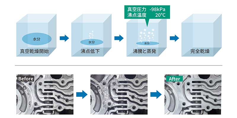 「『EVADRY』に備えられている減圧容器では、真空ポンプを使って-98kPa(キロパスカル)まで気圧を下げることができます。気圧が低いと水の沸点は下がり、およそ20℃で沸騰し蒸発するため、部品から水分を除去できるのが真空乾燥機の仕組みです」