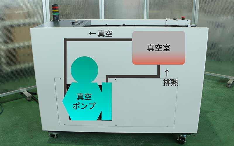 容器内を減圧するために使用する真空ポンプから生じる排熱を容器内に引き込んで、容器内や対象物の温度を上げ、乾燥効率を高めることで排熱利用を実用化させた