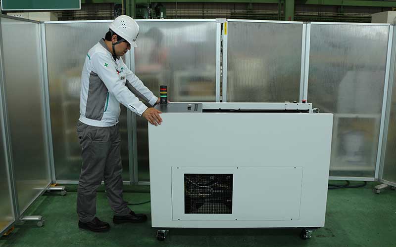 省スペース化、工場内での利用の効率化にも配慮された「EVADRY」は、キャスター付きで一人で移動させられるサイズも特徴
