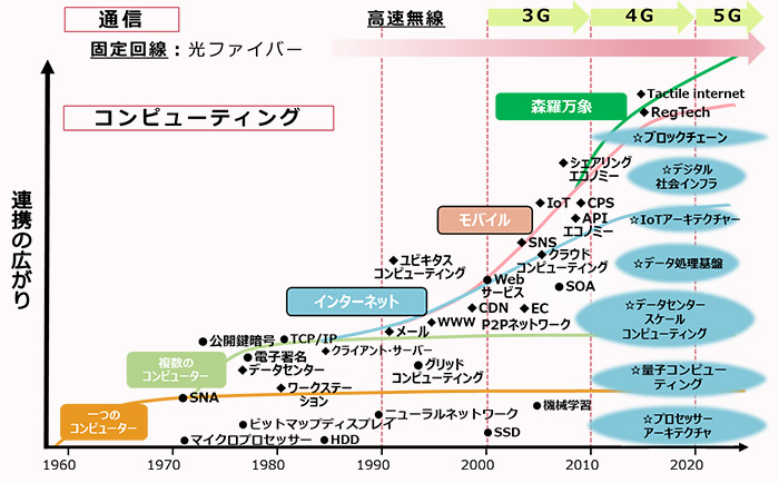 出典:CRDS調査報告書『デジタル化とエネルギー 〜ICT セクターの持続可能な成長のために〜』(P.5図表2‑1通信とコンピューティングの進展)より