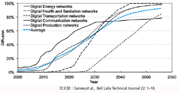デジタル化が中核となるエネルギーシステム、ヘルスケア、交通(自動運転)、通信、生産の米国における普及率推定のグラフ