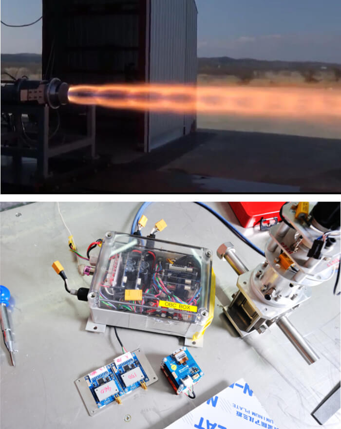 (上)独自開発する炭化水素系エンジンの燃焼実験の様子。(下)その組み立てはもちろん、試作や制御用の電子部品まで内製で手作りされている