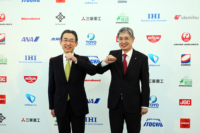 現ANAホールディングス副会長・平子裕志氏(左。撮影時はANA代表取締役社長)とJALの代表取締役社長・赤坂祐二氏(右)が手を取り合い、国産SAFの商業化、普及に向けて取り組んでいくとした