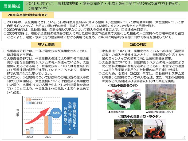 「みどりの食料システムには、目標を達成する上で必要なプロセスを具体化した『みどりの食料システム戦略』(以下、みどり戦略KPI)という指標が設けられています。その中に弊会がこれまで進めてきた農業用ヒートポンプの活用などとともに、小型の電動農機の普及と農業機械の自動操舵(そうだ)システムの活用を推進することが明記されているのです」