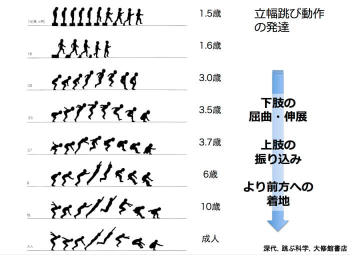 立ち幅跳び動作を比較した年齢別の運動能力の伸び率について。3.5歳以降、運動能力の伸び率にはほとんど変化がないことが分かる