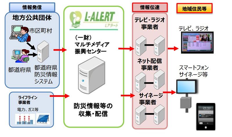 Lアラートとは、自治体が発信する安心・安全に関わる災害情報を集約し、テレビ、ラジオ、インターネットなどメディアを通じて一斉送信する共通基盤