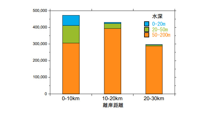 NEDOのデータを基にした洋上風力発電の開発可能性(縦軸はkW、横軸は離岸距離)。離岸距離が大きくなるほど、着床式の設置が可能な水深の割合が小さくなる