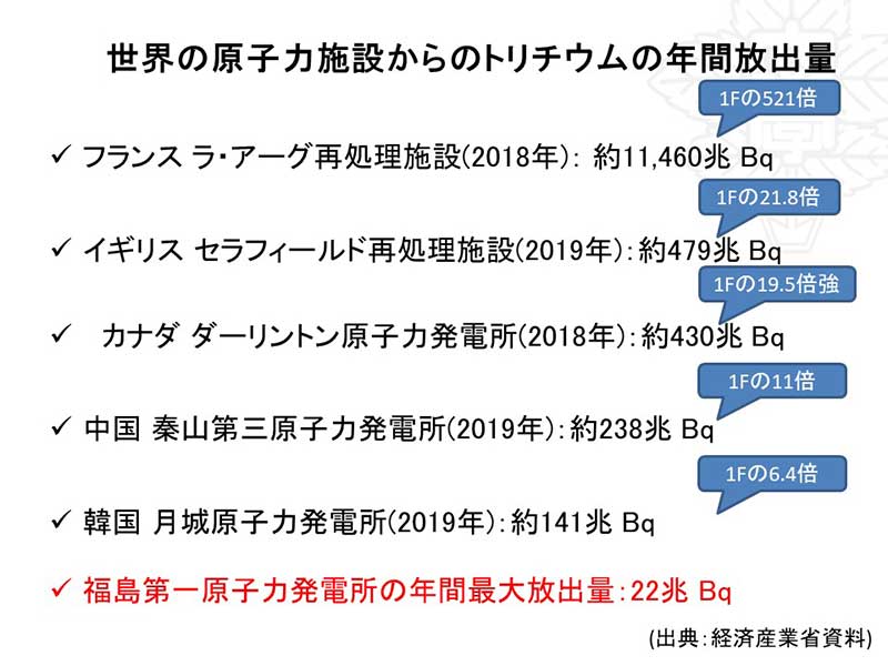 世界のトリチウム年間放出量。フランスの再処理施設が1Fの約521倍、イギリスの再処理施設は約21.8倍。アジアでも中国の原子力発電所が約11倍、韓国の原子力発電所が約6.4倍と高い値になっている
