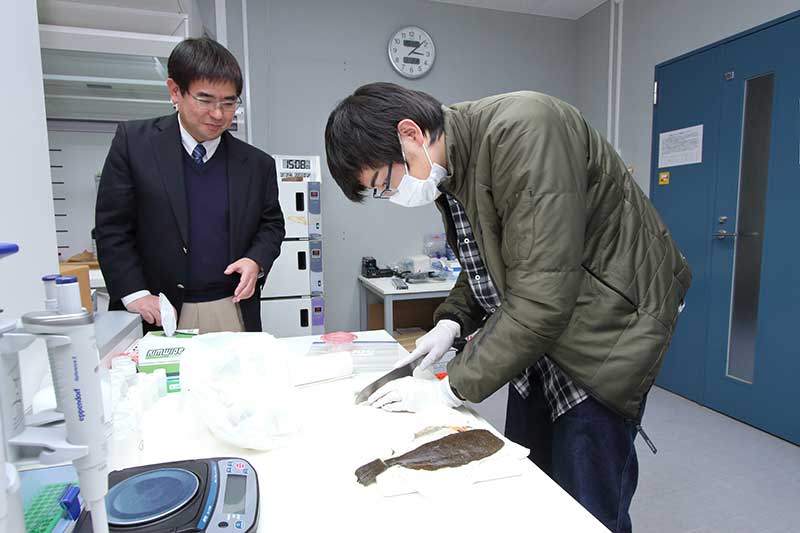 鳥養教授の研究室では、マイクロ波加熱法を行うために学生が魚をさばくことも