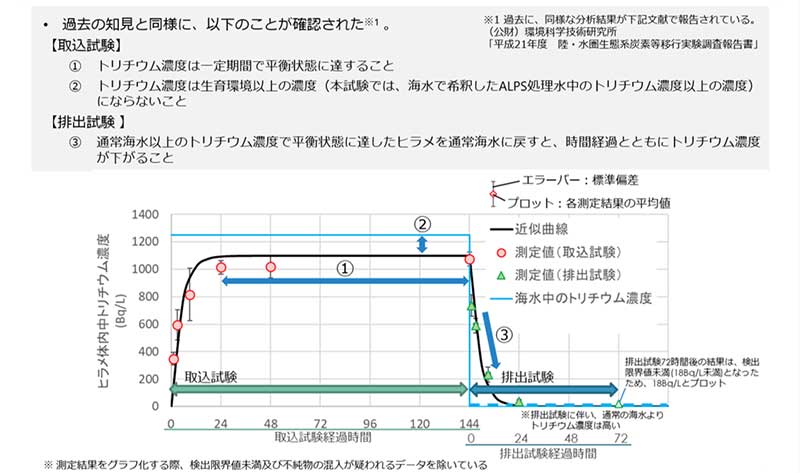 「トリチウム濃度の高い水の中に生物を移すと体内のトリチウム濃度が上がるため、濃縮を懸念された方などから質問を受けることがありますが、体内のトリチウム濃度は水中の濃度より高くならず一定となり、生物を通常の水に移すと濃度が下がっていきます」
