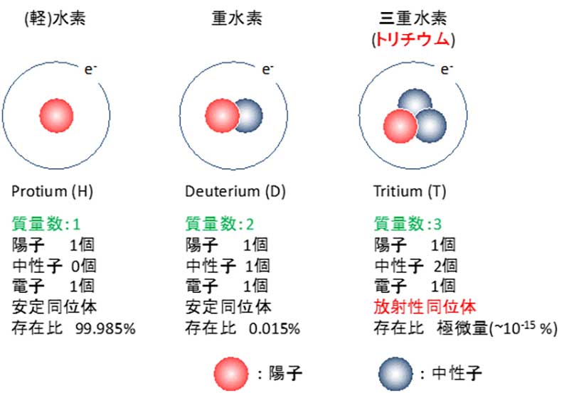 水素には同位体である軽水素(1H)、デューテリウム(重水素:2H)、トリチウム(三重水素:3H)の3種類が存在し、化学的性質はほぼ同じだが、トリチウムのみ放射線(ベータ線)を放出する。このトリチウムの特徴について、鳥養教授は次のように解説する。