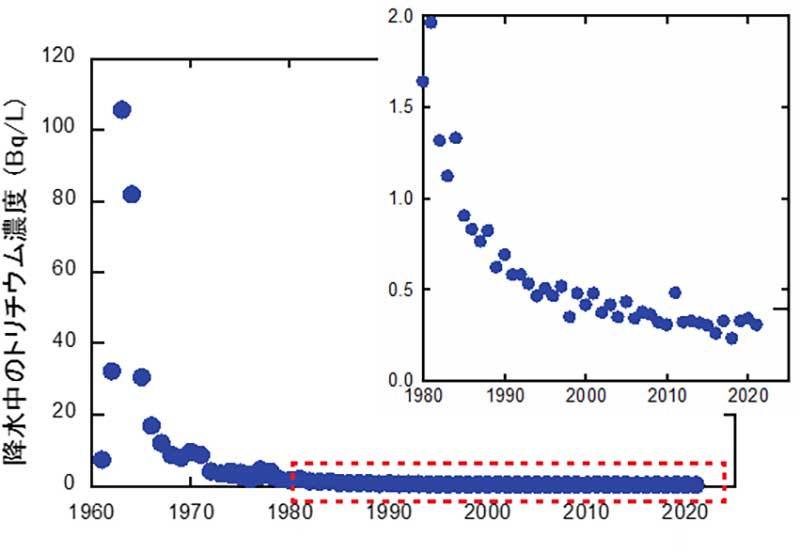 「雨水に含まれるトリチウムは、1960年代前半に高い数値を示し、70年代以降は低い数値で推移しています。60年代の高い数値は米国など国連の安全保障理事会常任理事国が大気圏内で核実験を頻繁に行ったためです」