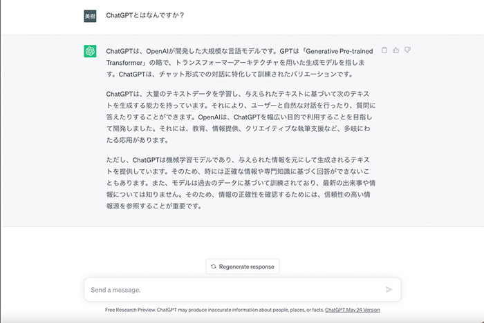 従来の対話型AIとの違いとしては、ChatGPTは対話形式で質問に回答できるだけでなく、翻訳や文章の要約といったさまざまなタスクにも返答できるなど、汎用的な調整が施されている。そのため、ChatGPTはどんな質問に対しても“確からしい”情報を返してくれ、それが多くの人々に衝撃を与えた。