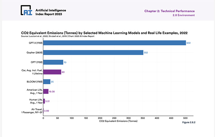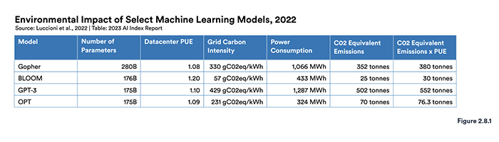 AIモデルの選択による環境負荷 2022年版。米国スタンフォード大学のレポートによると、2022年における4つのAIモデル(GPT-3、Gopher、OPT、BLOOM)の環境負荷の比較では、GPT-3の電力消費量は1287MWhとありトップの数字を示している