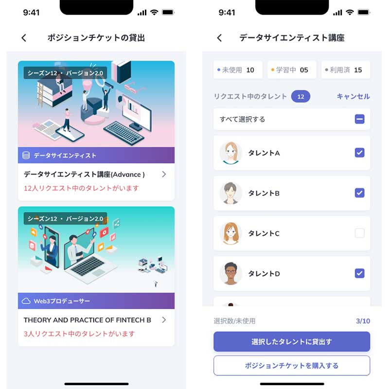 ONGAESHIのサービスイメージ。スポンサーが購入した受講権NFTをタレントに貸し出す画面 ※画面のデザインは制作中のもの