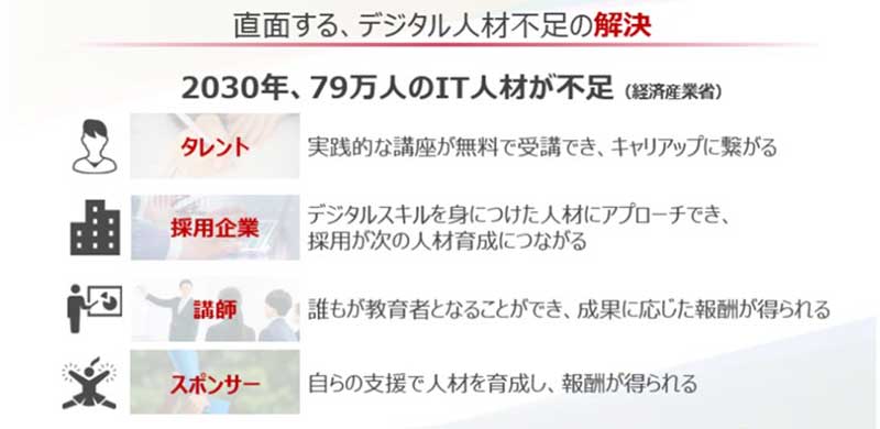 こうした中、経済産業省の調査では、日本のデジタル人材は2030年には79万人が不足し、IT・デジタル分野にとどまらず日本企業の国際競争力の低下が危惧される。
